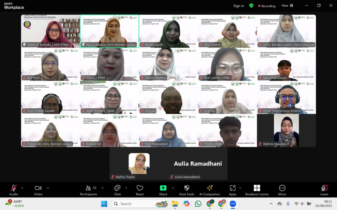 Program Studi D3 Analis Kesehatan Universitas Borneo Lestari (UNBL) melaksanakan kegiatan Monitoring dan Evaluasi (Monev) Pasca Akreditasi pada hari Jumat, 1 Agustus 2025. Kegiatan ini dilaksanakan secara daring dan menghadirkan asesor dari Lembaga Akreditasi Mandiri Perguruan Tinggi Kesehatan (LAM-PTKes), yaitu Ibu Baterun Kunsah, S.T., M.Si., dosen dari Universitas Muhammadiyah Surabaya.