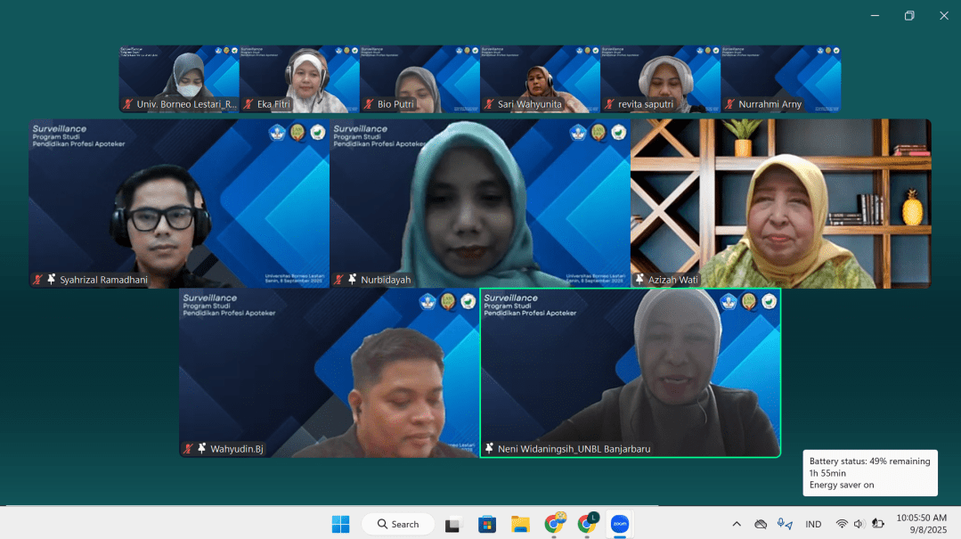 Program Studi Pendidikan Profesi Apoteker (PSPPA) Universitas Borneo Lestari (UNBL) melaksanakan kegiatan Monitoring dan Evaluasi (Monev) Pasca Akreditasi pada hari Senin, 8 September 2025. Kegiatan ini dilaksanakan secara daring dan menghadirkan asesor dari Lembaga Akreditasi Mandiri Perguruan Tinggi Kesehatan (LAM-PTKes), yaitu Ibu Dra. Azizah Wati MS., Apt.